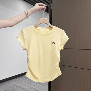 KR105、白いしわが腰のプリントtシャツの女性の純粋な欲望の丸首の正肩の半袖の夏の小さい飛袖の短いタイプは修理します。