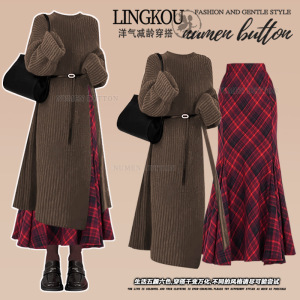 咖色毛衣+红格鱼尾裙 【两件套送腰带】