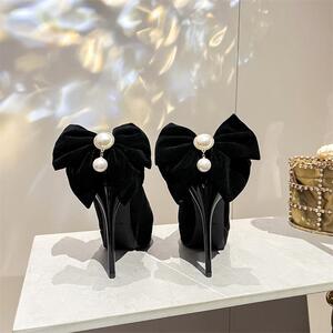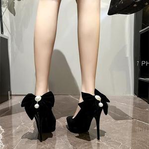 2025 新しい秋と冬の黒の防水プラットフォーム超ハイヒールの女性のポインテッドトゥスティレットリボンパールシングルシューズ 11 センチメートル