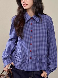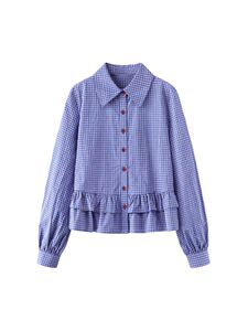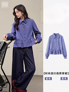 広色の青い格子のシャツの女性の春の夏の新型のiu系はハスの葉の縁のシャツの上着の短い卸売りを着ます。