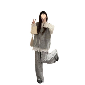春季女装套装2025新款韩系宽松灰色马甲白色蕾丝衬衫阔腿裤三件套