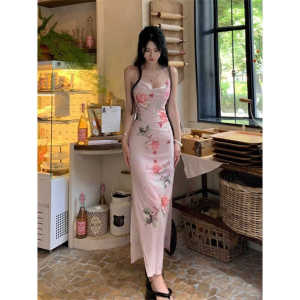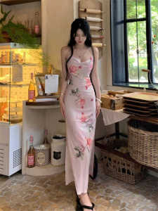 ファッショナブルな純粋な欲望スタイルの花柄サスペンダードレス女性の夏の気質背中の開いたスリムフィットボトムヒップカバーロングスカート