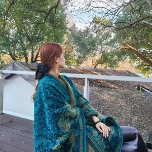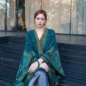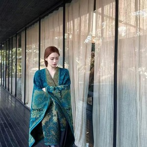 ピーコックの青いストールの外で女性の雲南新疆のチベットの大西北の旅行は写真を撮る民族風のマントを着ます。
