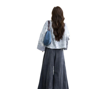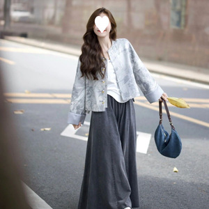 大码新中式国风套装女春秋胖盘扣外套显瘦阔腿裤裙两件套200斤