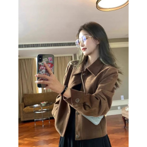 ブラウン鹿革ベルベットジャケットレディースショート2025春秋韓国風ルーズカジュアルレトロ小柄ジャケットトップ