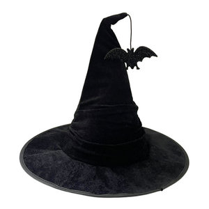 ベルベットのしわのある魔女の帽子: コウモリの吊り下げ飾り付き
