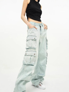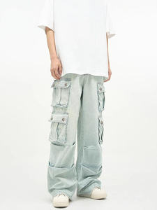 ファッションブランドの爆発的なアメリカの多ポケットジーンズの男性ズボンの小衆の復古的な腰の広い足の工装のカップルのモップのズボン
