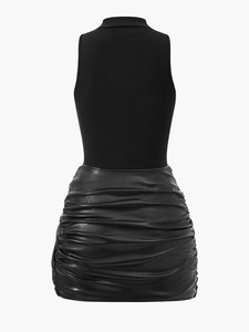 2025 クロスボーダー Amazon ヨーロッパとアメリカの女性の無地ノースリーブミニドレス + フロントタイ PU 装飾 2 点セット