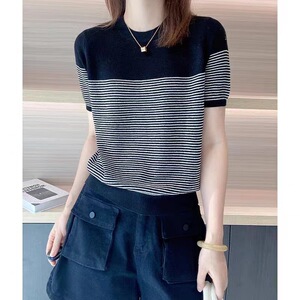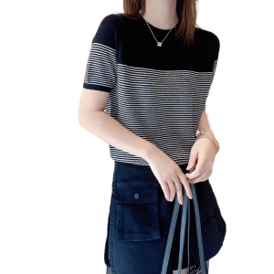 2025 新しいファッションラウンドネックコントラストカラーハイエンドトップ多用途デザインニッチストライプ半袖セーター女性のための