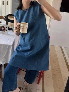 韓国系chic夏フランス式レトロ丸首ゆるいカジュアル純色ノースリーブチョッキデニムワンピーススカート女性