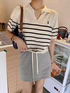 夏季POLO领T恤女藏蓝色条纹短袖人头马刺绣翻领t恤冰丝通勤