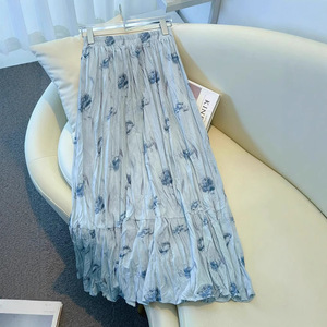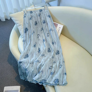 ブルー花柄スカートミドル丈レディース夏薄手2025新作ハイウエストアンブレラスカートプリーツスカートAラインロングスカート