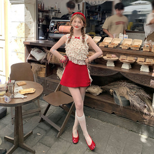 ラウンドネックリボンフリル水玉ベストトップ女性の夏の新しいハイウエストスリムスカートファッションスーツ