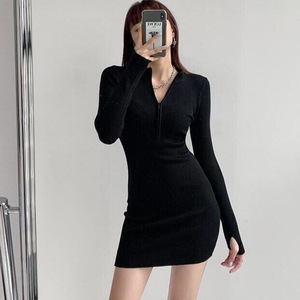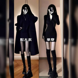 辣妹纯欲风拉链半高领包臀修身打底女秋冬长袖小黑裙紧身连衣裙