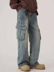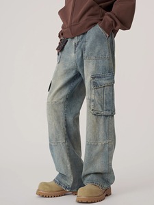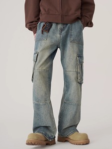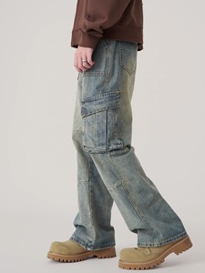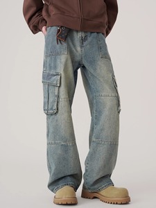 口袋工装牛仔裤男直筒宽松阔腿美式高街裤子潮牌痞帅水洗复古拼接