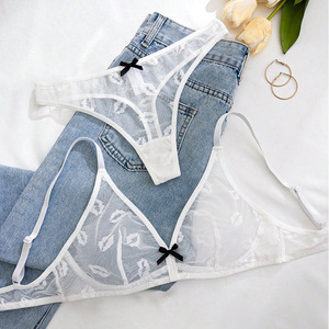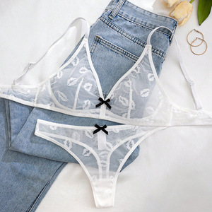 跨境外贸蕾丝嘴唇情人节丁字裤女士无钢圈内衣套装内裤低腰
