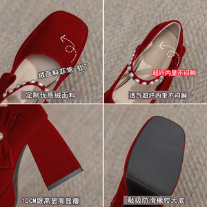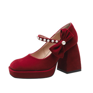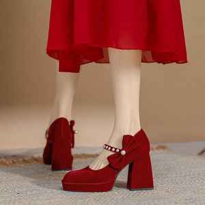 (在庫あり) 小さな赤い防水プラットフォームハイヒールの女性の厚いヒールフレンチメアリーパールウェディングシューズ新しいスタイルの靴