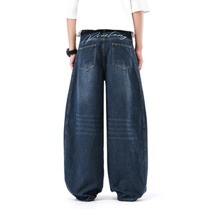 アメリカンレトロ風ウォッシュ加工カーブドジーンズ メンズ デコンストラクト ワイドレッグ ゆったり カジュアル ロングパンツ