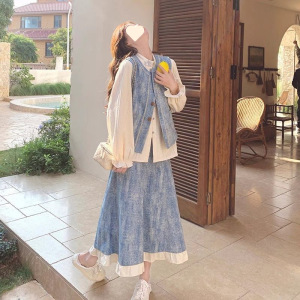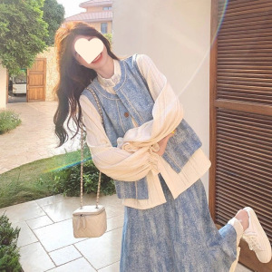 【拼接连衣裙】蓝色小清新牛仔提花套装裙女春季2025新款设计感马