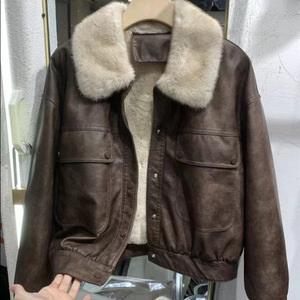 ヨーロッパ製ベルベットレザージャケットレディース冬香港スタイルレザーライダースジャケットレッキスラビットファー裏地ショートトップ