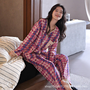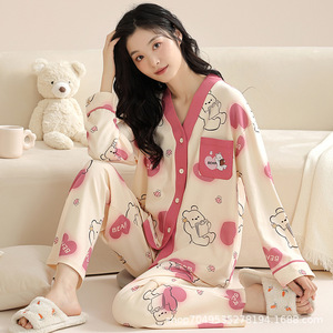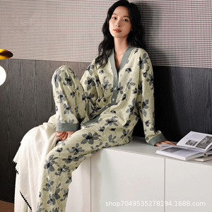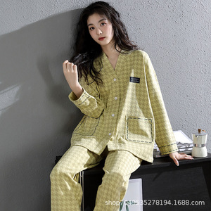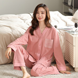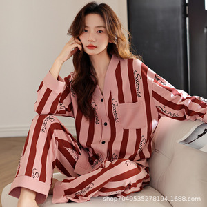女性用高級綿パジャマ、春、秋、夏の長袖Vネックストライプ韓国風ツーピーススーツ、家着としても着用可能