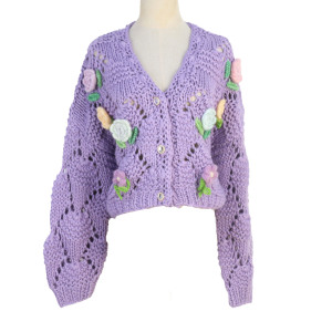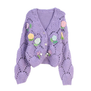 パープル 19454 ソフトでワックスのような立体的な花の中空セーター カーディガン