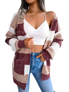 ヨーロッパとアメリカの秋冬のコントラストストライプランタンスリーブカジュアルカーディガンセータージャケットのリアルショットアマゾンクロスボーダーレディースウェア