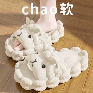 かわいいヒツジの動物のスリッパの女性は糞感を踏んで滑り止めの大気を感じます。
