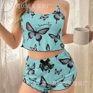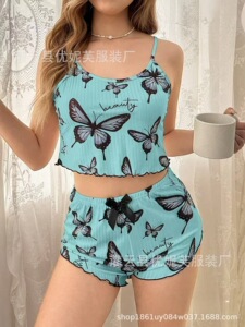 25希音熱売パジャマ2点セット女性クロスボーダー爆金新製品蝶プリント欧米家庭服プリント坑条