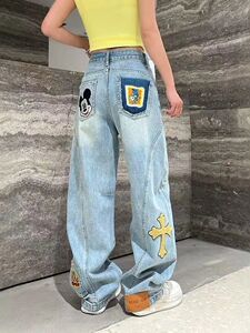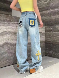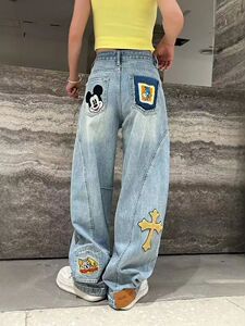 浅蓝色米奇卡通弯刀牛仔裤女2025年夏季新款时尚潮流刺绣镰刀香蕉