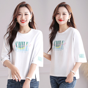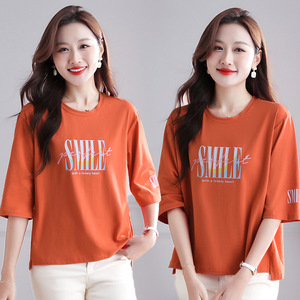 純綿七分袖 Tシャツレディーストップス 2025 新作夏ルーズ半袖スタイル黒ミッドスリーブボトリングシャツ