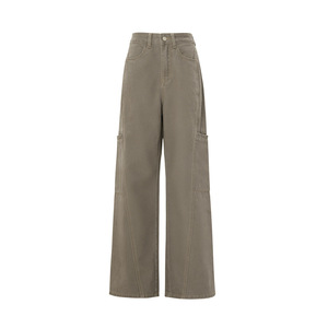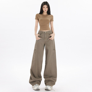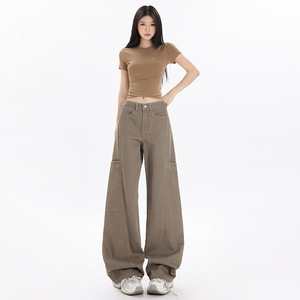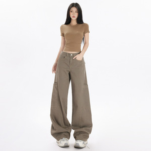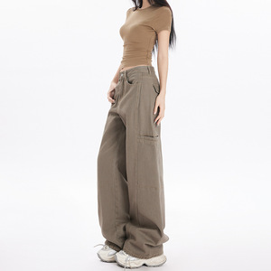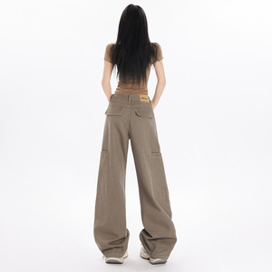 包邮一件代发 咖绿美式复古宽松工装牛仔裤女春显瘦高腰阔腿长裤