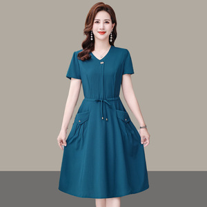 中年女性の新しい夏のスタイルのドレス、半袖、エレガントなカラー、母親のハイエンドスカート、ウエストを絞って痩せる