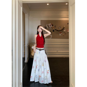 2025フランスのユニークな赤いPOLO襟の首の小さなベストのストラップのプリントのスカート