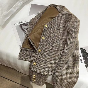 卡其色短款2025早秋款英伦简约气质名媛毛呢小香风上衣开衫外套女