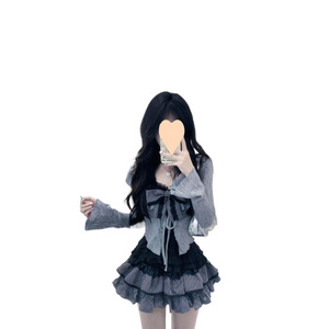 暮色的物语少女感黑色蕾丝荷叶开衫显瘦蛋糕拼接吊带半身裙三件套