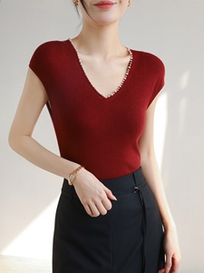 ファッショナブルなUネックミレットビーズショルダースリムフィットテンセルシルクセーター女性用夏プルオーバーボトムストップアウターオフホワイト