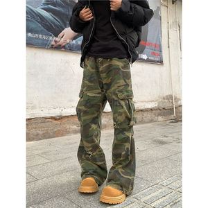 美式高街水洗迷彩多口袋破洞设计感直筒微喇牛仔裤男女百搭长裤潮