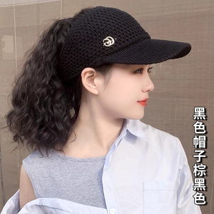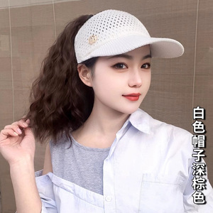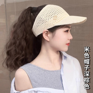 新しい小さなラベルの帽子とウィッグ一体型ウールカーリーハイポニーテール中空サンシェード日焼け止め春、夏、秋の空のトップハット