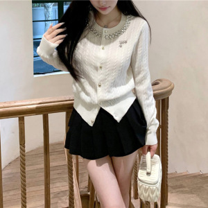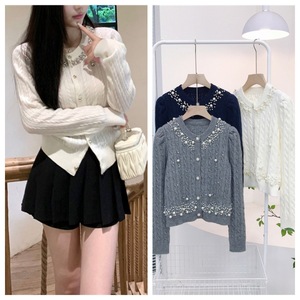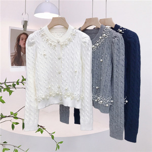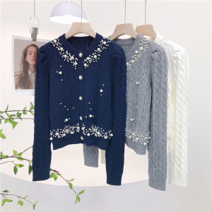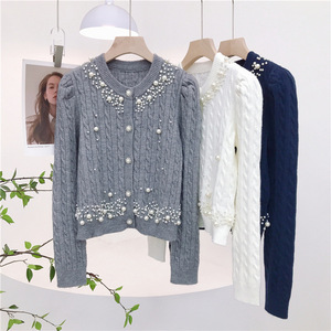 7843 秋冬セレブの香りラウンドネックパフスリーブツイストビーズシープカシミア厚みのあるニットカーディガンジャケット