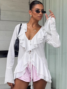 フランスのシフォンvネックのラッパの袖のハスの葉の辺の長袖のシャツ2025欧米の春夏のファッションの新型の越境の上着