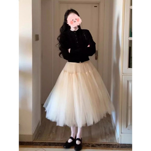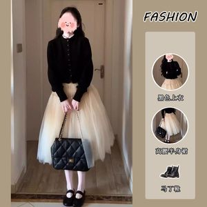 女性のためのスーツ 2025 春韓国スタイル年齢軽減長袖黒ニットセータートップハイウエストメッシュふわふわスカート