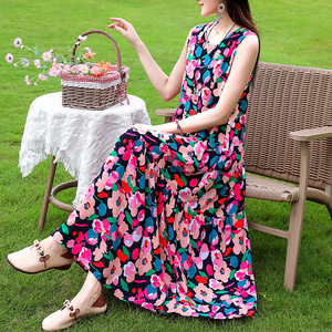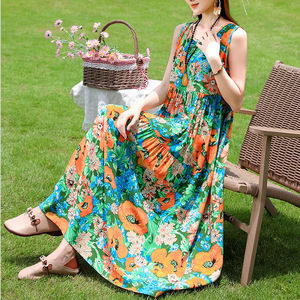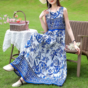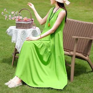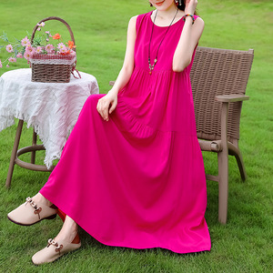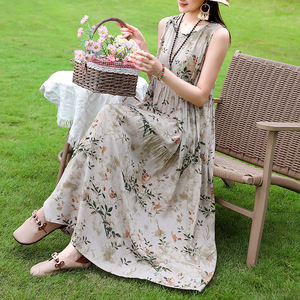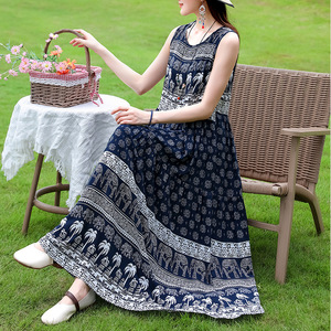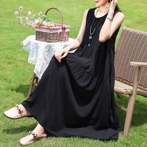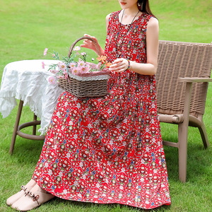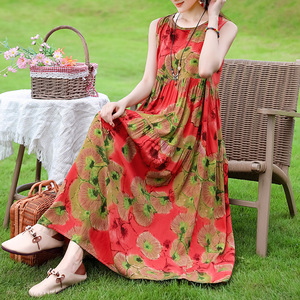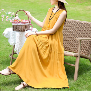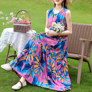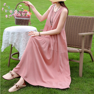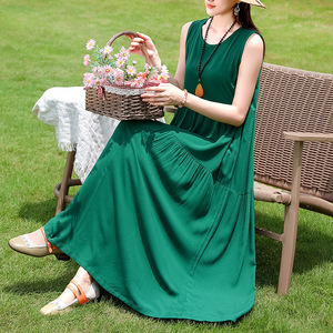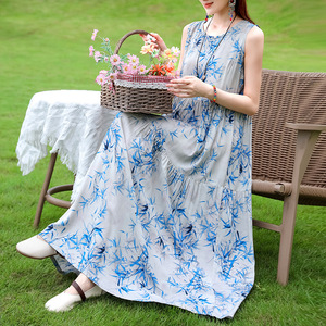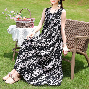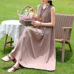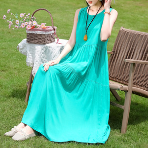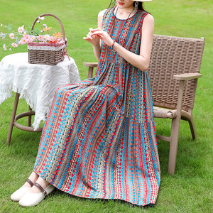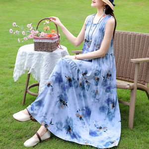 綿のシルクのワンピースの女性の新型のお母さんの袖なしのベストの気質の高級な精巧な夏の海辺の休暇のビーチのロングスカート