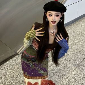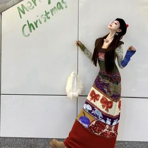 プラスサイズのファットmmエスニック娘デザインプリントステッチコントラストカラースリムロングドレス、ネックロープ付き
