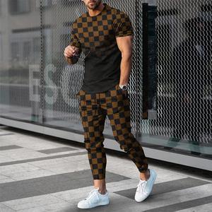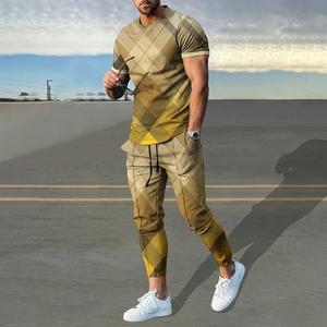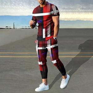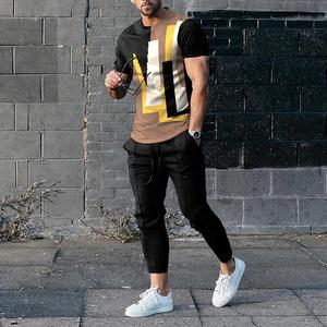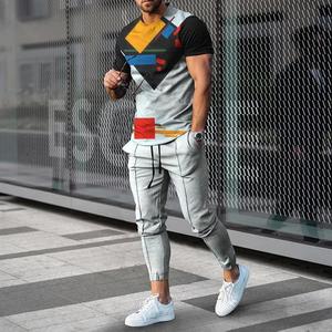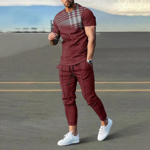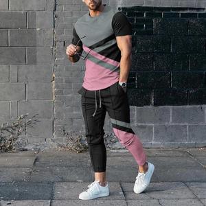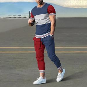 男性のスーツの夏の青年の半袖のtシャツのストライプは色のゆったりした弾力の薄い運動のズボンの2つのセットをつづり合わせます。