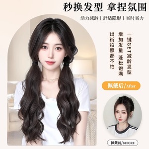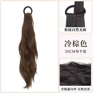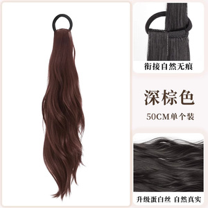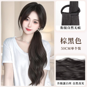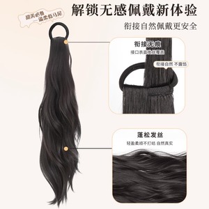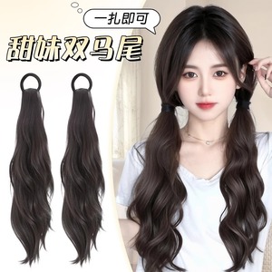 ロングヘアの女性用ダブルポニーテール、ナチュラル人工毛、ストラップタイプ、ローカット、元気で甘い女の子、少しカーリーなポニーテールヘアピース、ヘアアクセサリー