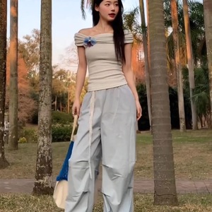 【オリジナル生地】2025年夏レディース半袖Tシャツ新作人気フレンチストライプブルーワンショルダーショートスタイル
