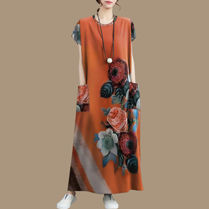 卸売2025夏のホットスタイルの女性のプリントルーズ年齢軽減お腹カバーマザーズウェアポケットアウタードレス
