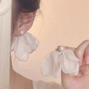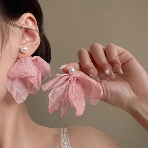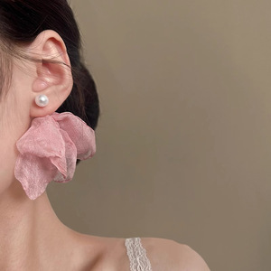 【蜜桃茶】ローマの休日仙気ピンクの白い花イヤリング女性の高級感誇張リゾート耳飾り