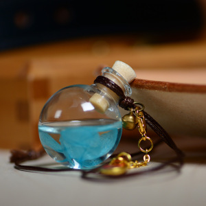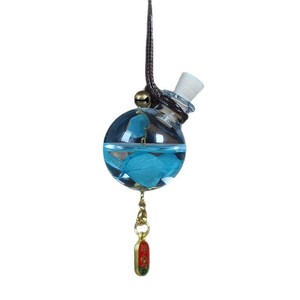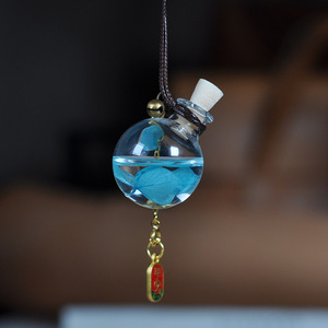 車に乗っているアロマペンダントの小さなガラス瓶の車に掛けられた高級感の置物が無事に瓶の香水瓶のドライフラワーに落ちた